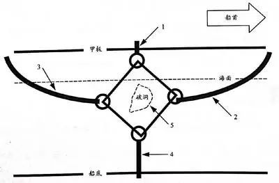 船舶防水堵漏注意:大船使用的堵漏毯四周采用铁链或钢丝绳加强,中部辅以小号钢丝绳作经纬,用至少两层帆布缝制而成,四角应设强力耳环供张索受力,四个角的张索均为钢丝绳。使用堵漏毯时,下端应坠以重物,使其能垂到船底。底索应有足够长度绕过船底,与前张索、后张索、控制索配合,使堵漏毯覆盖于破洞,然后用纹车等收紧并固定各张索。在堵漏毯被破口钢板或船体突出物挂住时,应妥善处理,避免硬拉造成堵漏毯损坏,如图所示。